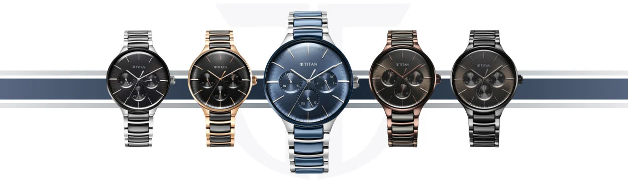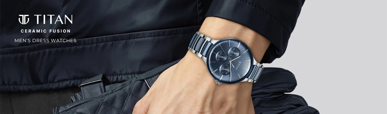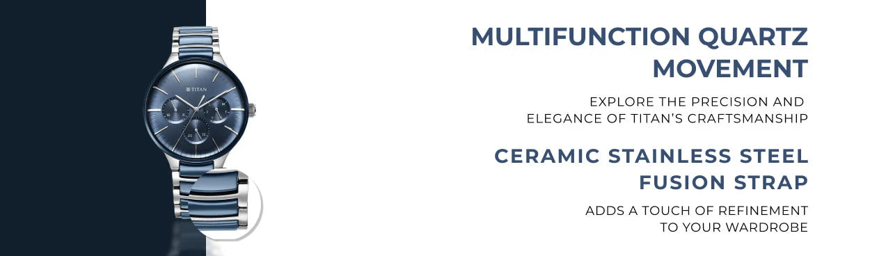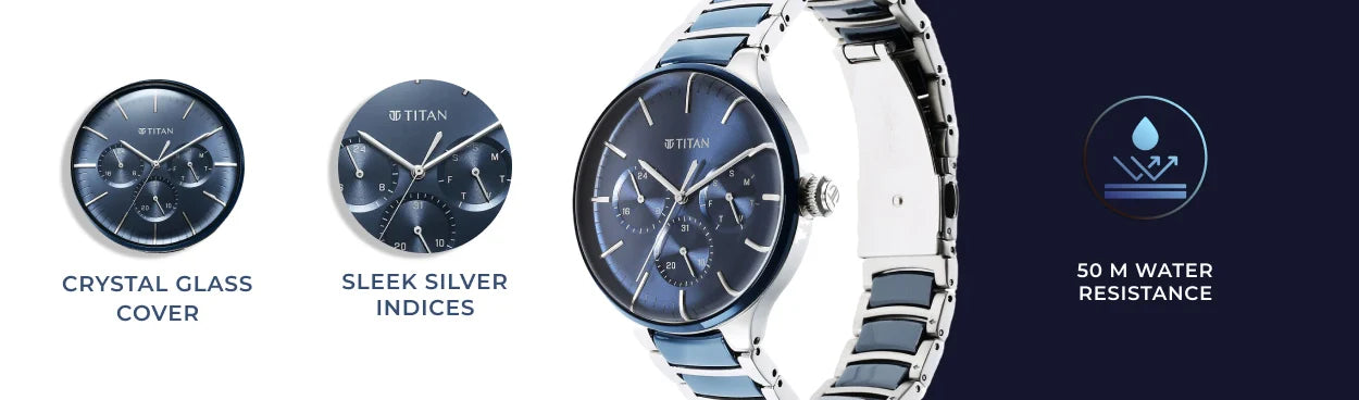 Titan Ceramic Fusion Quartz Multifunction Blue Dial Silver Dual-Toned Stainless Steel Bracelet Watch for Men