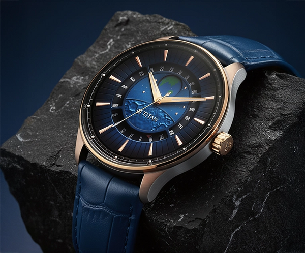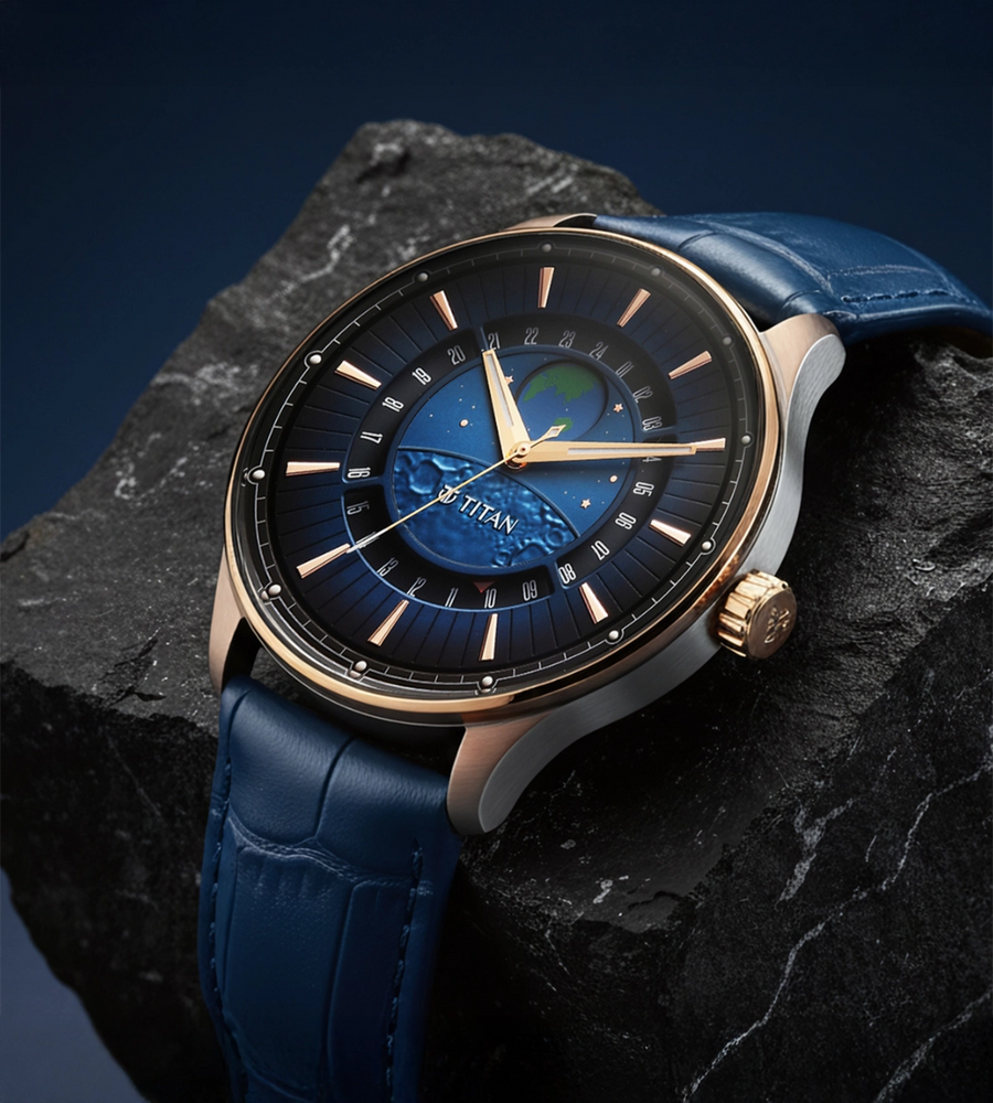Titan Stellar Analog with Earth Disc and Blue Dial Leather Strap Watch for Men - With its rotating Earth Disc complication, this watch reveals shifting continents and oceans every six hours. At 10:10, the silhouette of India comes into view - an orbital moment that pays tribute to our place in the cosmos. Powered by the in-house Quartz 7126A calibre, the Earth Disc marries accuracy with artistry, offering a horological first that transforms the way you view time. Choose between the Gray Landscape or Blue Landscape editions, each reflecting Earth's beauty from a different perspective.