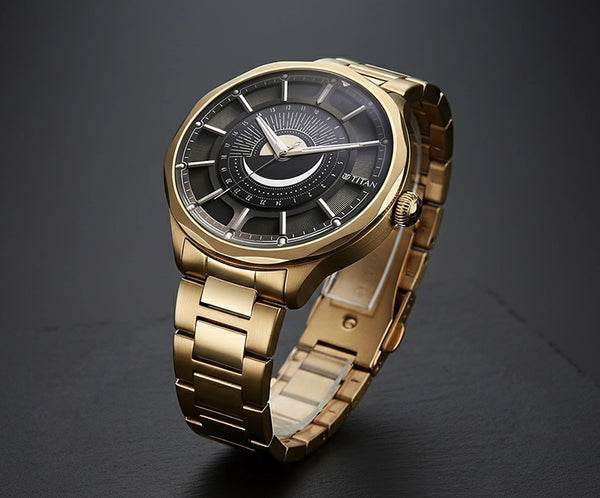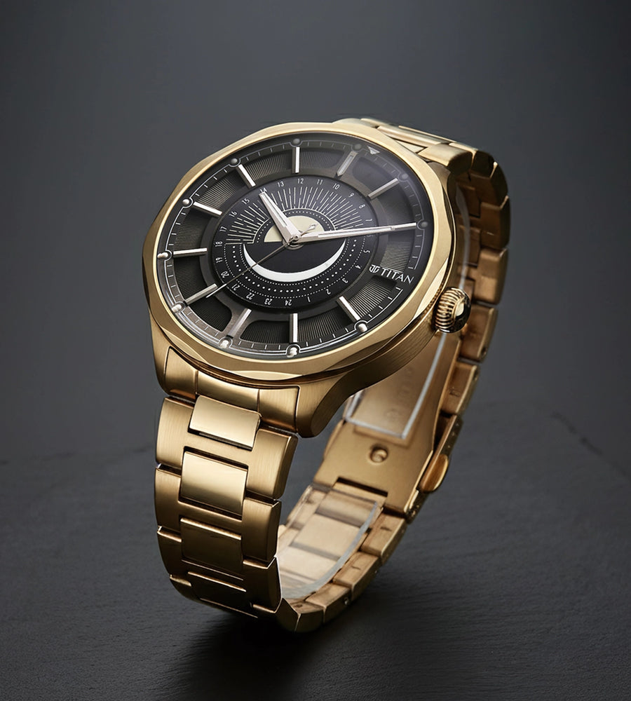 Titan Stellar Analog with Sun Moon Phase and Black Dial Carnation Gold Stainless Steel Strap Watch for Men - Step into the cosmic realm with a watch inspired by ancient astronomy, where the Sun and Moon intertwine in a mesmerizing 24-hour display. The centre dial, shaped like a black hole silhouette, creates infinite depth against the faceted bezel. The in-house Quartz 7137B movement powers this geometric Sun-Moon disc, turning time into a poetic spectacle. Available in Bronze Patina, Classic Steel, and IP Bronze variants, each timepiece balances bold geometry with timeless elegance.