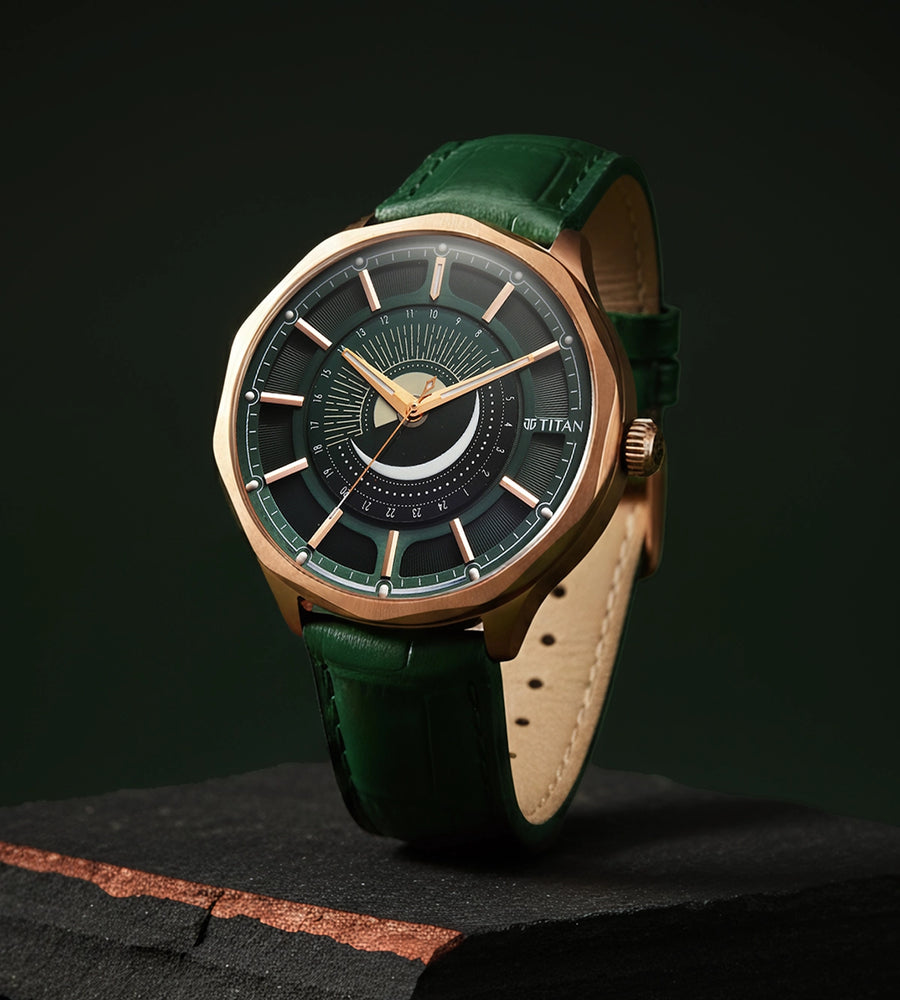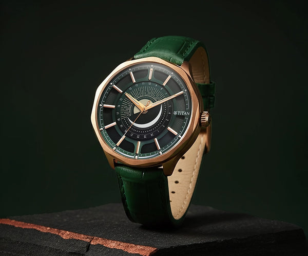 Titan Stellar Analog with Sun Moon Phase and Green Dial Green Leather Strap Watch for Men - Step into the cosmic realm with a watch inspired by ancient astronomy, where the Sun and Moon intertwine in a mesmerizing 24-hour display. The centre dial, shaped like a black hole silhouette, creates infinite depth against the faceted bezel. The in-house Quartz 7137B movement powers this geometric Sun-Moon disc, turning time into a poetic spectacle. Available in Bronze Patina, Classic Steel, and IP Bronze variants, each timepiece balances bold geometry with timeless elegance.