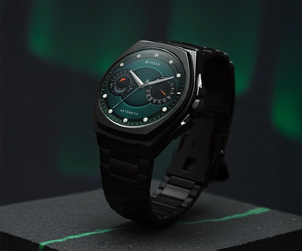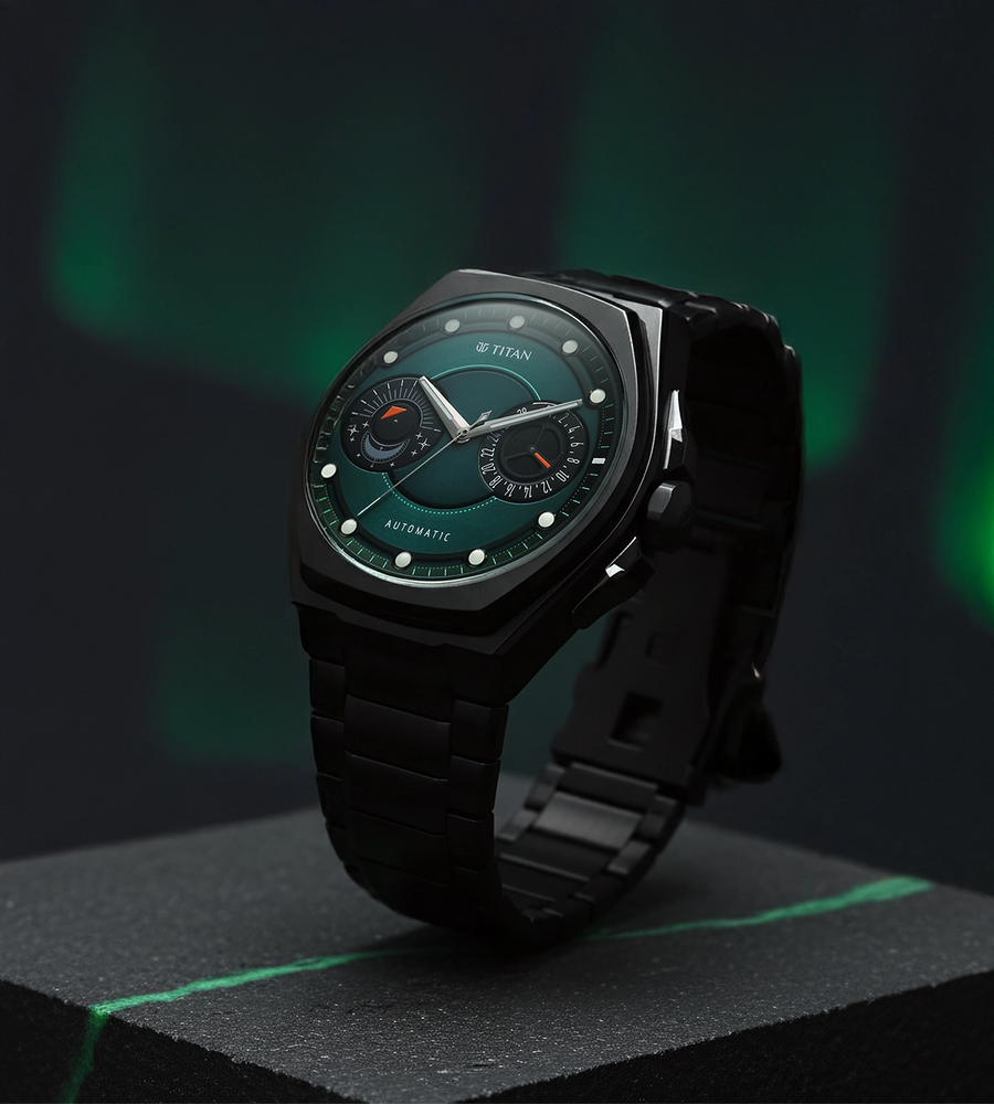 Titan Stellar Aurora Caelum Sun Moon Phase Green Dial Titanium Strap Automatic Watch - Aurora Caelum celebrates the ethereal beauty of the cosmos through a rare fusion of premium materials and classical horology. Crafted entirely from Grade-5 titanium, the case and bracelet offer exceptional lightness and strength, while the edges are polished using zaratsu finishing, giving the watch a refined brilliance from every angle. Powered by Titan's in-house Automatic 7AM32E calibre, Aurora Caelum brings to life the classical Sun-Moon display, framed by a unique case shape that stands apart in the Stellar universe. The exhibition back reveals a customised rotor, underscoring its deep design story and engineering mastery. Limited to 500 numbered timepieces, Aurora Caelum is a rare collector's piece that unites celestial inspiration with cutting-edge craftsmanship.