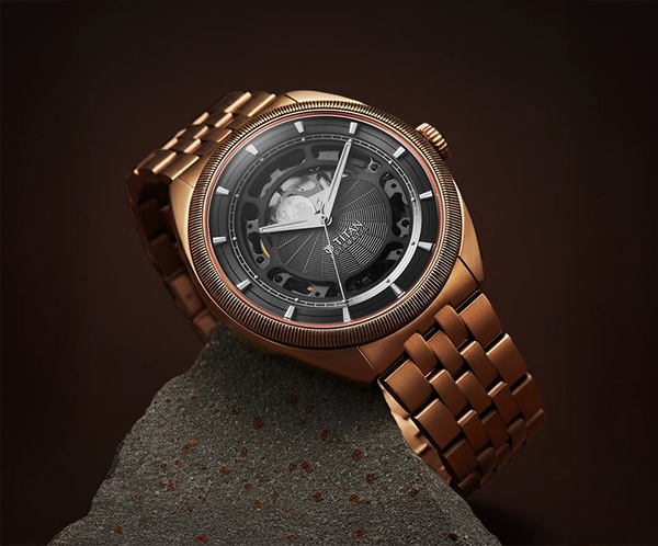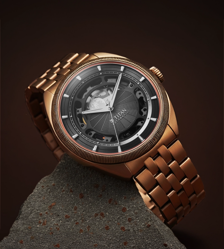Titan Stellar Cupola Automatic Analog with Sun Moon Phase and Gray Dial Bronze Stainless Steel Strap Watch for Men - Inspired by cupola domes and the grand instruments of medieval astronomy, the Cupola Skeletal reveals its horological depth through a layered, open-worked construction. The Sun-Moon disc is set on a translucent polycarbonate sheet, allowing you to glimpse the calibre beneath while the centre dial is decorated with an intricate CNC guilloche pattern. This interplay of transparency and texture makes every glance a discovery. At its core beats the in-house Automatic 7A-27 calibre, powering the Sun-Moon complication with enduring precision. Available in IP Bronze, Classic Leather, and IP Gun variants, the Cupola Skeletal fuses architectural finesse with Titan's deep design ethos.
