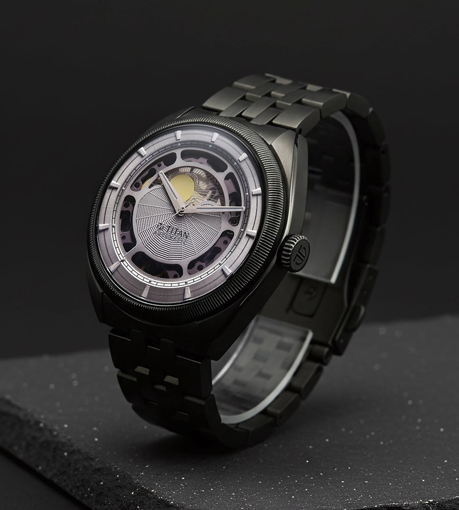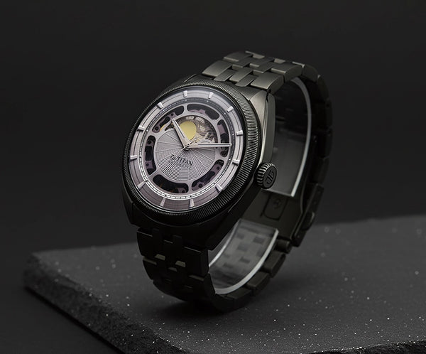 Titan Stellar Cupola Automatic Analog with Sun Moon Phase and Silver Dial Dark Gun Stainless Steel Strap Watch for Men - Inspired by cupola domes and the grand instruments of medieval astronomy, the Cupola Skeletal reveals its horological depth through a layered, open-worked construction. The Sun-Moon disc is set on a translucent polycarbonate sheet, allowing you to glimpse the calibre beneath while the centre dial is decorated with an intricate CNC guilloche pattern. This interplay of transparency and texture makes every glance a discovery. At its core beats the in-house Automatic 7A-27 calibre, powering the Sun-Moon complication with enduring precision. Available in IP Bronze, Classic Leather, and IP Gun variants, the Cupola Skeletal fuses architectural finesse with Titan's deep design ethos.