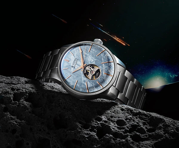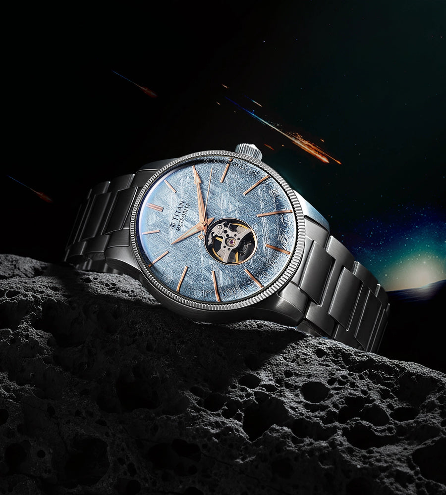 Titan Stellar Ice Meteorite Automatic Analog with Open-Heart Watch for Men - A fragment of the cosmos on your wrist. Crafted from authentic 120,000-year-old Muonionalusta meteorite, the Ice Meteorite glows with icy blue plating and unmatched rarity. Its exhibition back case reveals the in-house automatic movement with a custom rotor, celebrating Titan's deep design story. Limited to 500 timepieces, the Ice Meteorite is offered in a single striking variant, Ice Meteorite Steel, making it one of the rarest Stellar creations. Key Features: Authentic meteorite dial with icy blue plating, Curved sapphire crystal with 3-layer anti-reflective coating, Exhibition back case with custom rotor